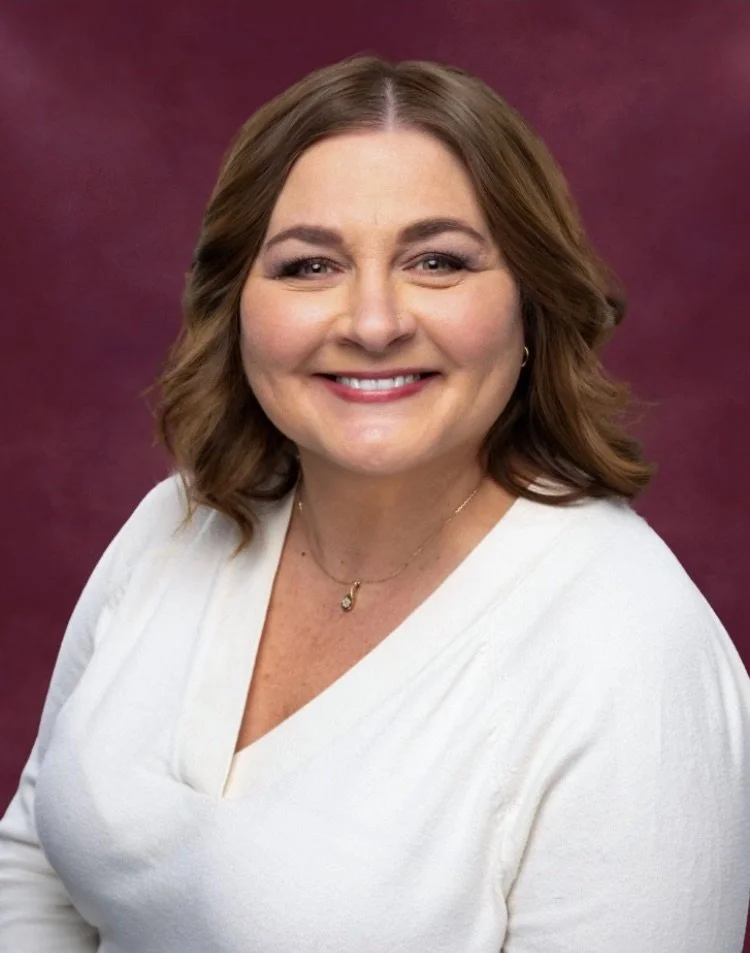 A woman with shoulder-length brown hair smiling, wearing a white top and a delicate necklace, against a maroon background.